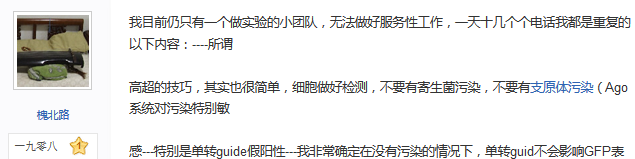 韩春雨的回复:细胞做好检测,不要有寄生菌污染,不要有支原体污染(Ago系统对污染特别敏感——特别是单转guide假阳性——我非常确定在没有污染的情况下,单转guid不会影响GFP表达,假阴性也大多因为细胞污染,假阳性和假阴性我都遇到过,国内买的细胞我就不吐槽了),转染用的质粒质量要好(可用30ngGFP转细胞,若是均一且效率高表明质量好,强弱不均一则表明质量差,越不均一表明质量越差),guide磷酸化完全(没有磷酸化不能load和切割——谢谢印证我的Fig2结果,至于怎么检测,自己跑个PAGE看看……)。