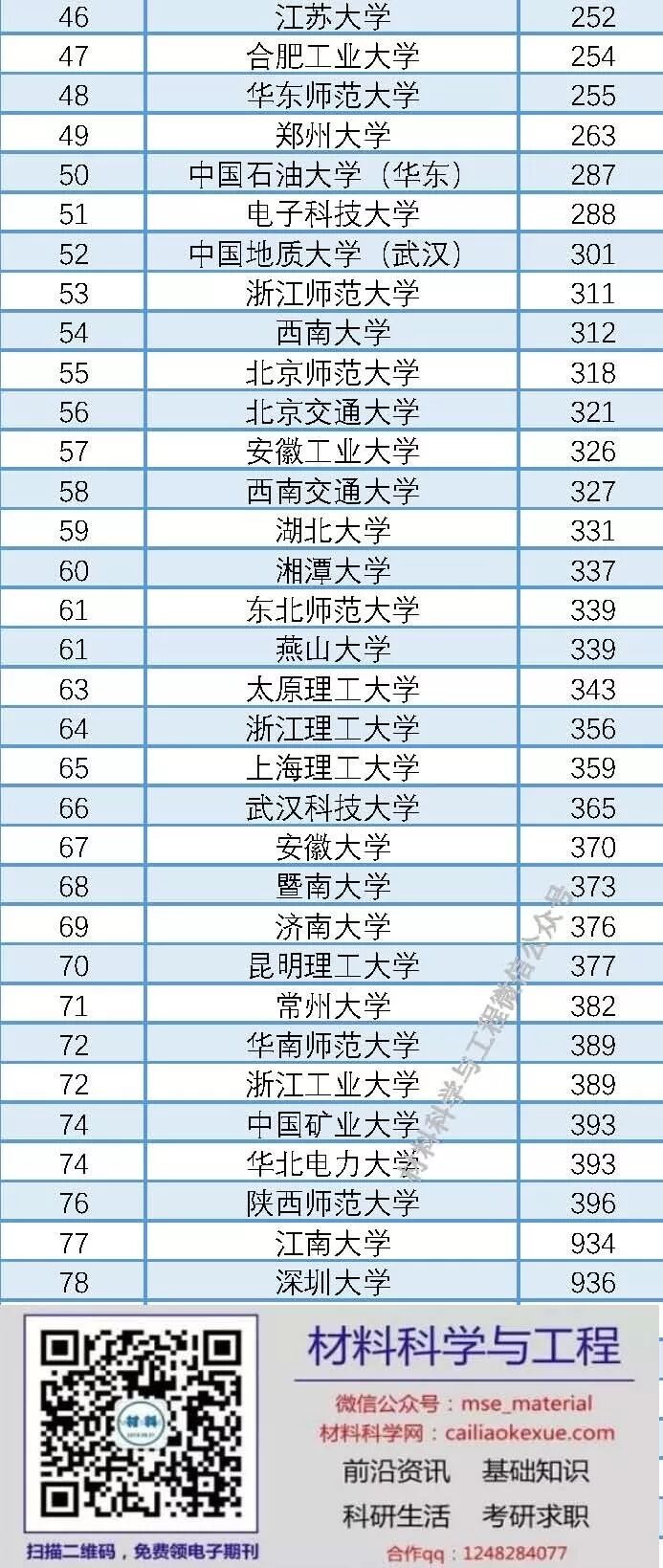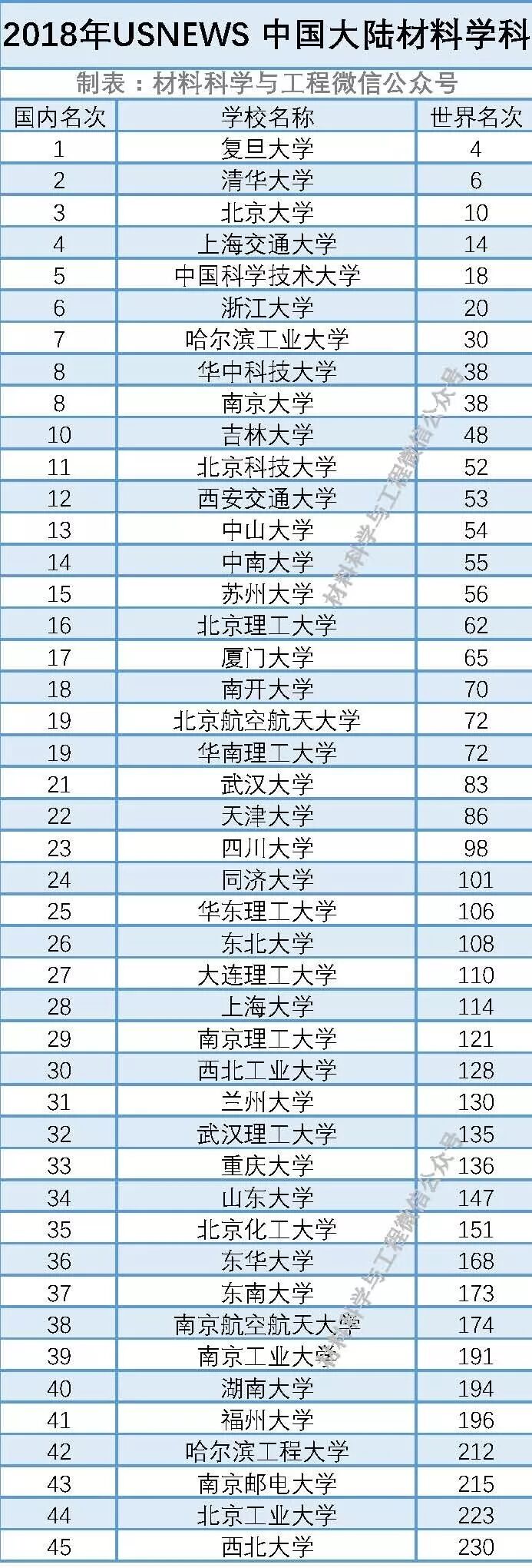 在材料学科,中国高校同样可圈可点,共78所高校入围。前十名共有四所大学,分别是第四名复旦大学,第六名清华大学,第十名北京大学。世界第一的是新加坡南洋理工大学,麻省理工和斯坦福大学分列二三名。