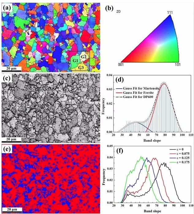 由于铁素体和马氏体均为BCC结构,EBSD无法直接鉴定出两相。该研究中,作者结合EBSD的BandSlope数据阐述了一种区分马氏体和铁素体的方法,计算出来的体积分数与实验结果接近。